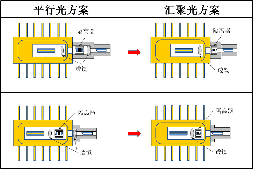 客户如采用此偏振无关/汇聚光隔离器,可以将传统平行光设计方案中问题严重的“适配器+透镜+隔离器”方案简化为成熟稳定的“适配器+隔离器”方案,不仅可以大幅提高产品耦合效率,还可以实现更高的生产效率和更稳定的生产制程。